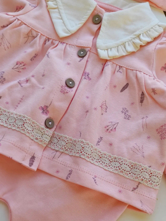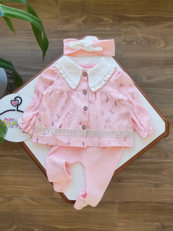 بلوز یقهدار با دکمههای چوبی و شلوار جورابدار به همراه هدبند ست. نرمی، لطافت و ظرافت در هر جزئیات برای خاصترین لحظههای نوزاد شما.