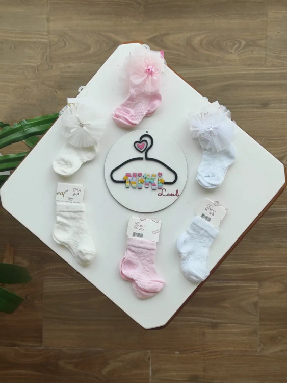جوراب نوزادی با طراحی جذاب در رنگهای سفید، صورتی و شیری. مدلها: توری و ساده. مناسب برای نوزادان صفر تا ۶ ماه. لطیف، راحت و مناسب استایل مهمونی کوچولوها.